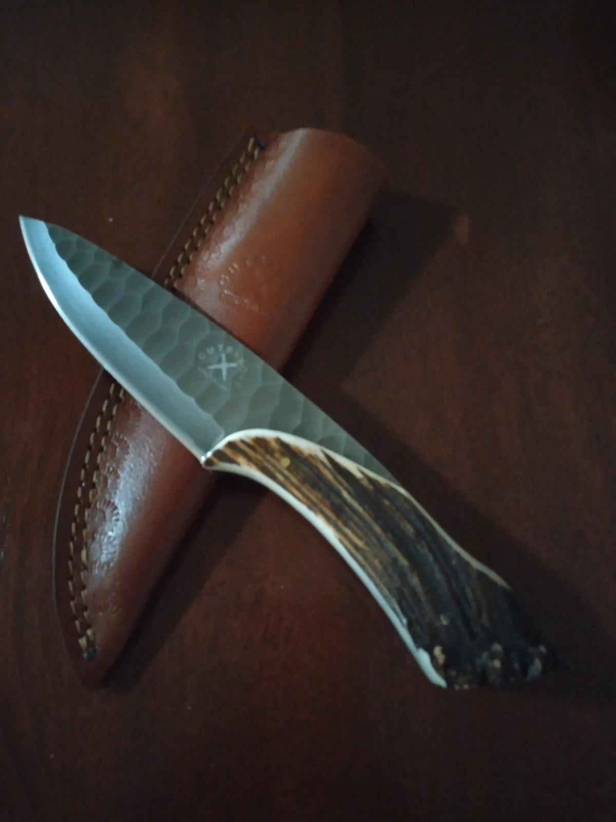 D2 Hammered Steel, powder coated with a Stag handle and leather sheath.